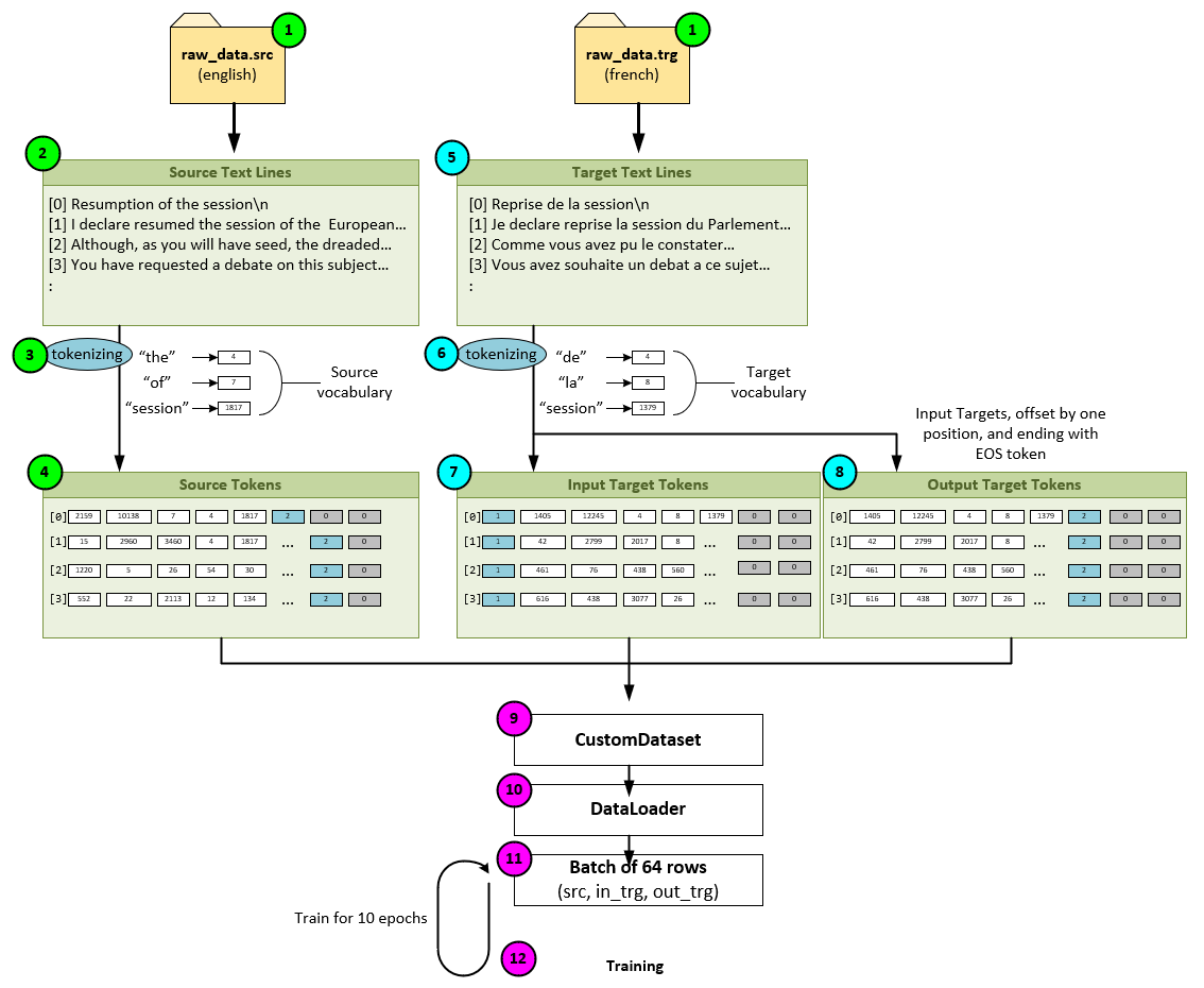 11.) During each training pass, the DataLoader collects batches of matching source data, target input data and target output data integer arrays and feeds them into the training process.